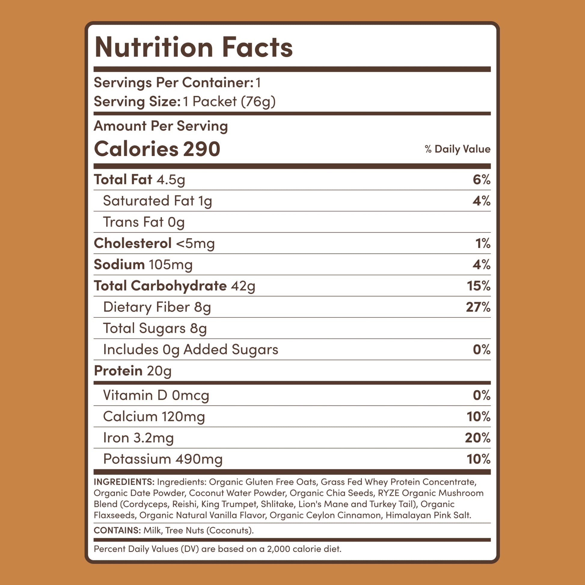 Packed with 20 grams of energy-boosting protein and our organic 6-mushroom blend. this first-of-its-kind breakfast transforms traditional oatmeal from bland to grand. Better focus. more energy. and a supercharged meal to keep you full for longer. No sneaky additives - just a delicious. nutritious start.