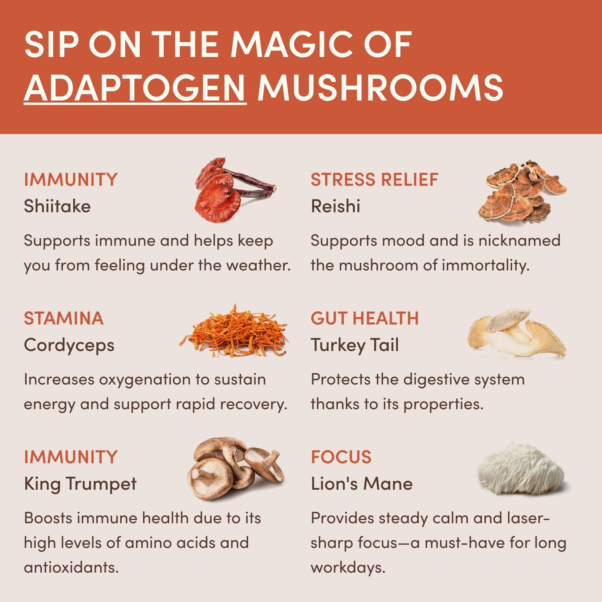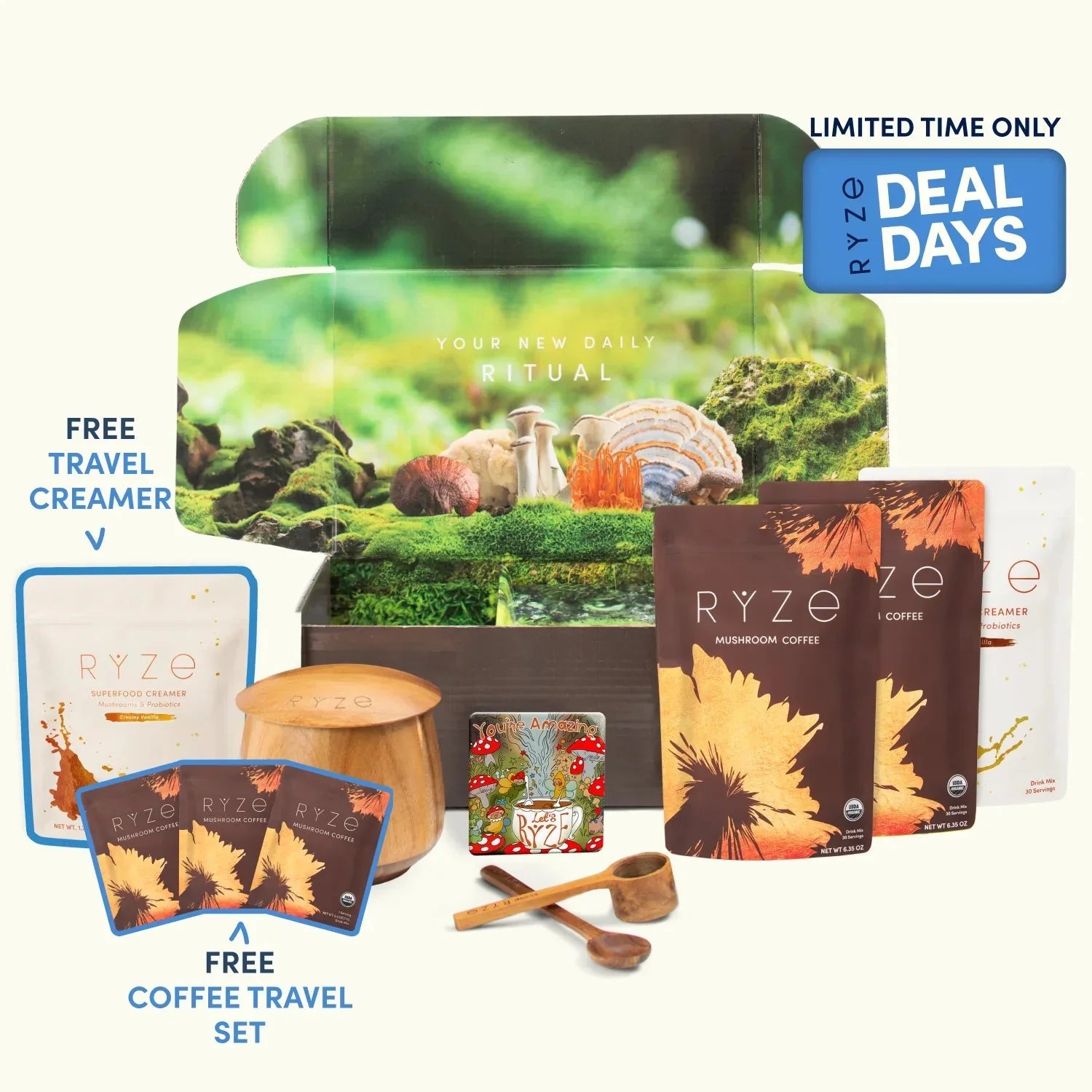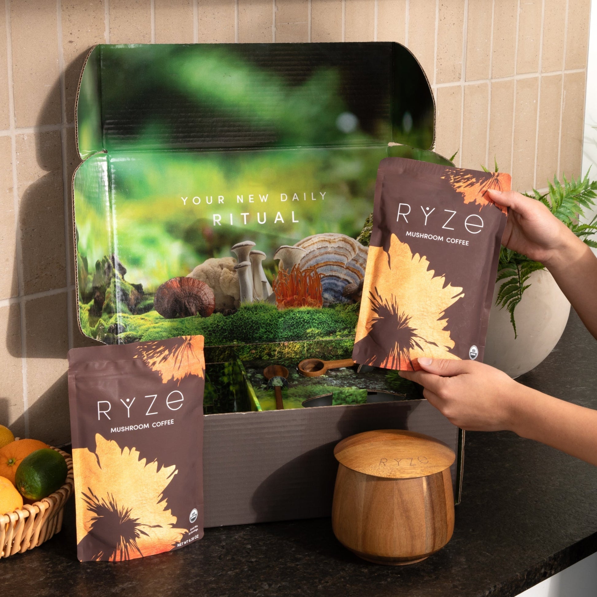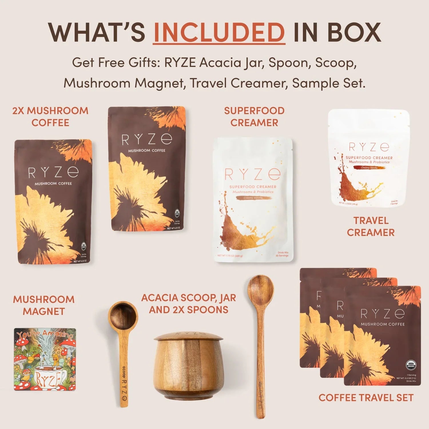 Accelerate your results with two cups a day and create your RYZE ritual. Enjoy two cups of mushroom coffee a day with our superfood creamer for an extra mushroom kick and creamy latte feel. On your first order. you'll receive a new tablespoon scoop for perfect portioning. a mushroom jar designed to keep your blend fresh. and a spoon for stirring.